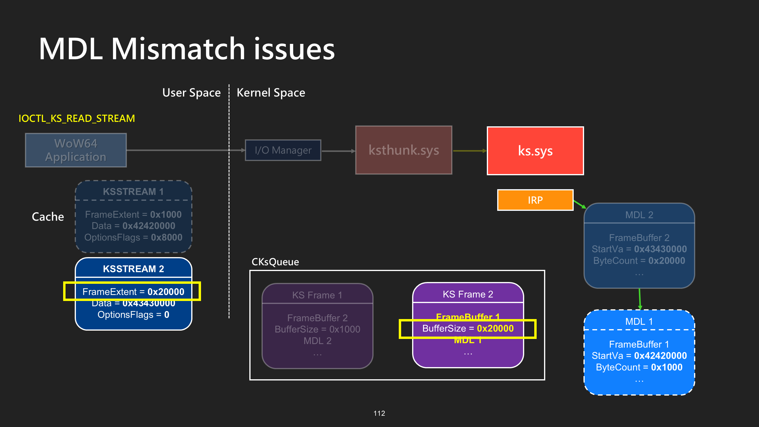 For the purposes of this post, it’s enough to understand that Kernel Streaming uses MDLs to manage frame buffers shared between user space and kernel space.