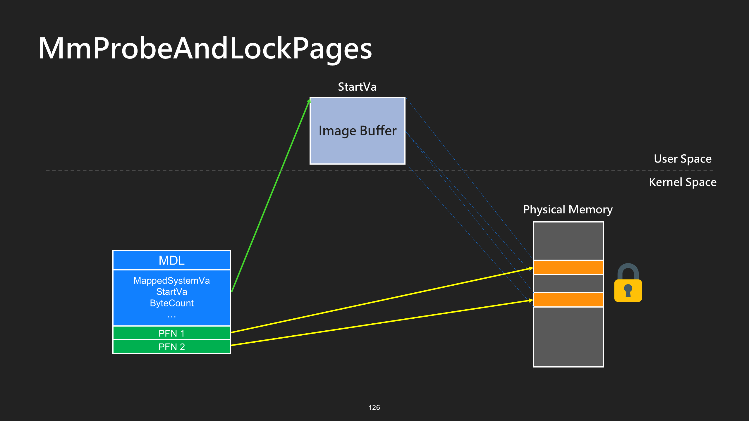 Next, the kernel calls MmProbeAndLockPages to lock the physical pages corresponding to the virtual address range, and to populate the PFN (Page Frame Number) array inside the MDL.